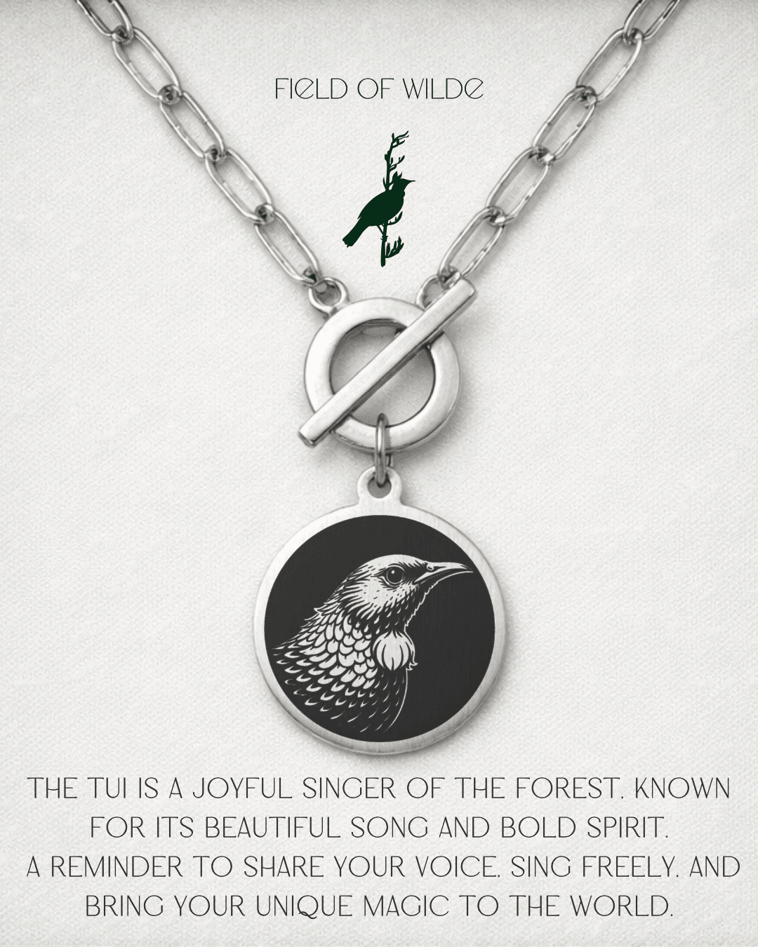 "THE TUI IS A JOYFUL SINGER OF THE FOREST, KNOWN FOR ITS BEAUTIFUL SONG AND BOLD SPIRIT. A REMINDER TO SHARE YOUR VOICE, SING FREELY, AND BRING YOUR UNIQUE MAGIC TO THE WORLD."